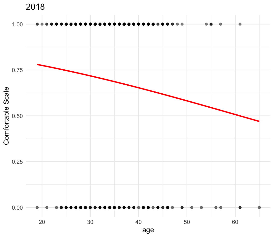 For the age and stigma analysis, a new dataset containing only age and question on the comfortable scale when talking to supervisor was created. We apply three regression models on the comfortable scale and age for 2016, 2018 and combination of both surveys. Zero will stand in for no, and one for yes. To visualize this procedure, we included graph for regressions. Since only the result for linear regression of 2018 data shows significant result, it’s the only one showing below.